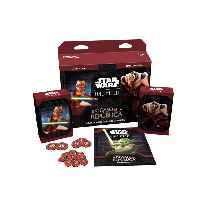 Caja de inicio para dos jugadores: Esta caja de inicio para dos jugadores contiene dos mazos completos con los que un amigo y tú podréis empezar a jugar y aprender las reglas sobre la marcha. ¡Encabeza una ofensiva coordinada con Ahsoka Tano o lidera ejércitos de droides como el general Grievous!