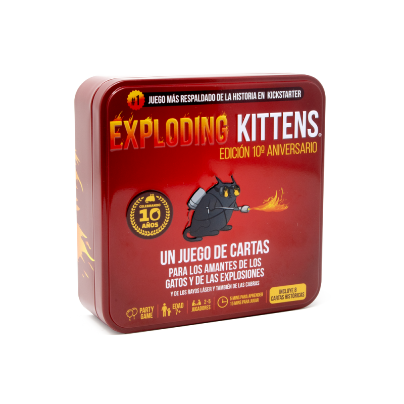 Se trata de una versión gatuna de la ruleta rusa con un gran componente estratégico. Los jugadores van robando cartas hasta que a alguien le sale un Exploding Kitten. Cuando esto sucede, esa persona muere y queda eliminada de la partida (a no ser que tenga una carta de Desactivación, que permite desactivar al Exploding Kitten con armas como punteros láser, friegas de barriga o bocatas de menta gatuna). El resto de las cartas de la baraja sirven para cambiar de lugar, mitigar o evitar a los Exploding Kittens.